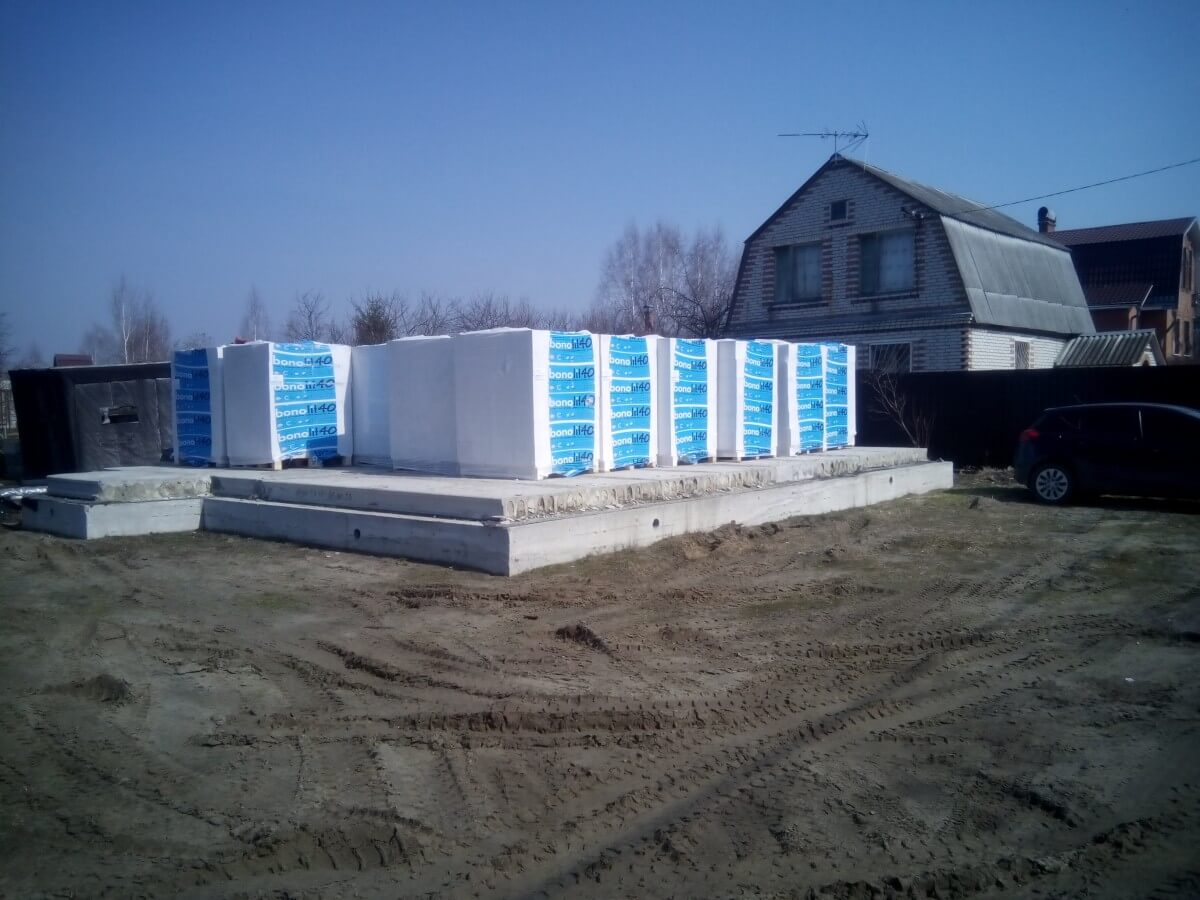 Строительство дома из газобетона в д. Петровское, Раменский район. Наружная отделка - декоративная штукатурка "Барашек" на силиконовой основе, отделка элементов фасада - искусственный камень.