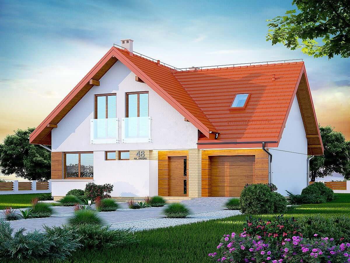 План дома "Осло" рассчитан на участок средней ширины. Дом имеет типичные размеры 10 х 12, поэтому его постройка обойдется не дорого. Проект относится к категории домов с выступом, направленным перпендикулярно дороге, что часто указывается в плане пространственного развития. Проект был создан для земельных участков, позволяющих отдельно стоящие здания. Проект может быть расположен на границе участка, что позволяет строить двухквартирные дома. Автор проекта предсказал наличие единственного гаража в линии строительства. Это также отличное предложение для людей, которые ищут дом с двускатной крышей, что снижает расходы. Проект "Осло" представляет собой одноэтажный дом с мансардой, благодаря которому мы можем наслаждаться большой площадью, даже на относительно небольшом участке. Сердцем дома является просторная дневная зона, в которой приятно проводить время вместе с близкими. Кроме того, просторная кладовая - полезная комната. Дневная зона также создает просторную гостиную со столовой, благодаря которой члены домохозяйства могут объединиться в одном месте. Камин, расположенный в гостиной, не только выглядит великолепно, но и обеспечивает приятное тепло в прохладные дни. Полностью функциональная ванная комната предусмотрена как на первом этаже, так и на чердаке, что является отличным решением для большего количества членов семьи. Спальная зона состоит из четырех комнат, Это отличный вариант для семьи из 4-6 человек. Пространство также может быть использовано в качестве комнаты для гостей или учебы. В доме также было место для практических хозяйственных помещений. Терраса является идеальным местом для организации семейных торжеств и минут отдыха.