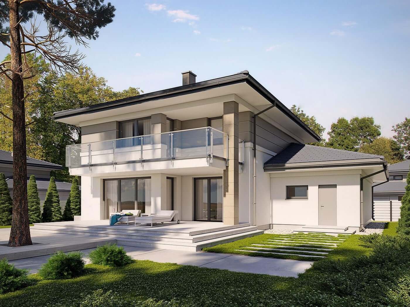"Лион" - проект представительского двухэтажного дома для семьи из 4 человек. Это типичная городская резиденция с современным обликом, размером 15 х 15 и оптимальной полезной площадью. Первый этаж был спроектирован как открытое жилое пространство, состоящее из объединенной гостиной, столовой и кухни. Здесь также есть дополнительная комната, которая может быть использована как кабинет или дополнительная спальня. На первом этаже также есть большая котельная для каждого вида топлива и гараж на две машины, благодаря покрытию частично крытых террас, частная зона отдыха была получена на террасе. На первом этаже расположены 3 спальни, ванная комната и прачечная. В главной спальне есть свой гардероб и ванная комната. Такое дополнительное пространство можно преобразовать, например, в рабочий уголок. "Лион" впечатляет утонченной, неподвластной времени классической формой, запечатленной в современном элегантном образе. Эта резиденция является отличным предложением для инвесторов, ищущих удобный и эстетичный дом.